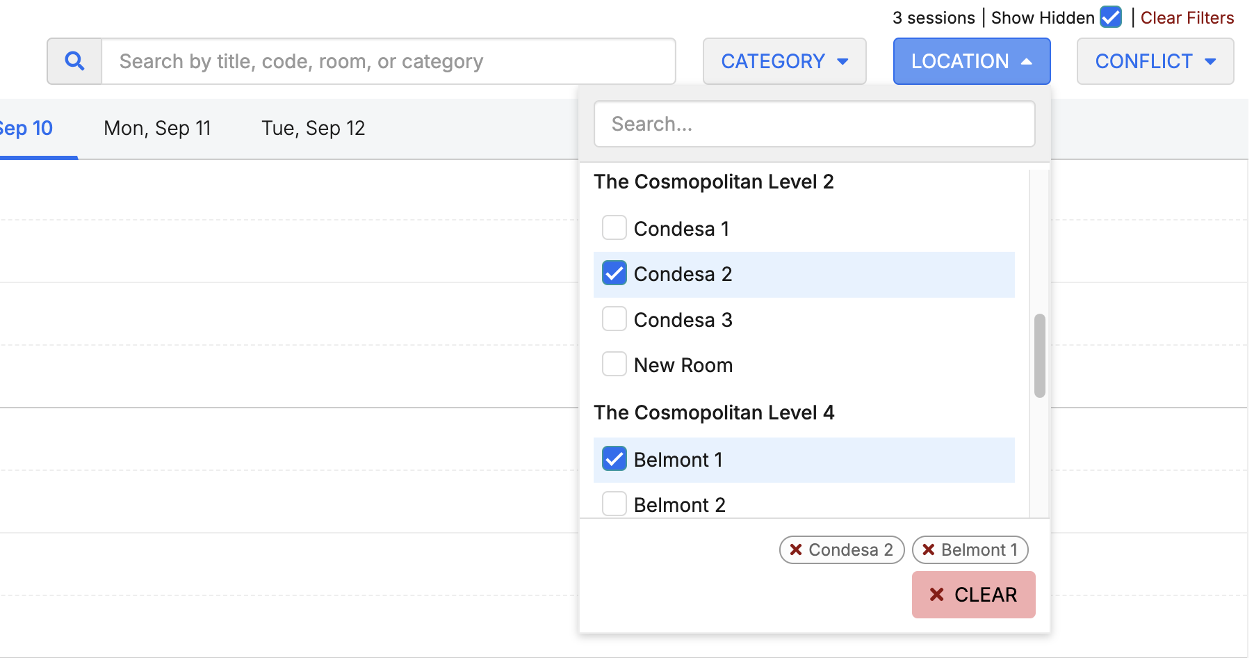 - Selecting this will allow you to see all sessions but will grey out sessions not applicable to your search for added context. Ex: If you filter to only see Speaker Conflicts, you may want to still see all sessions so you have context when move the session to resolve the conflict.