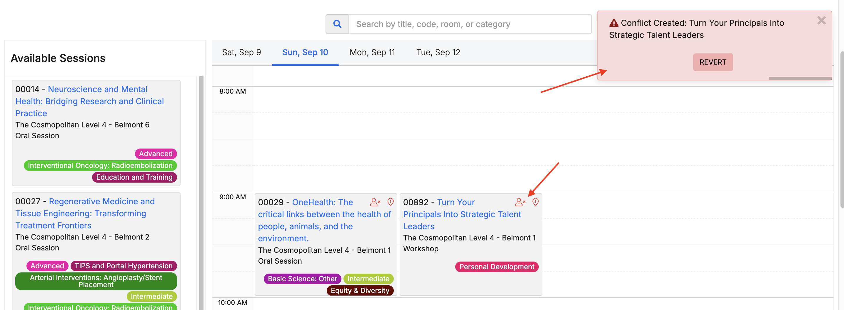 If you move a session and that act of dragging and dropping it creates a conflict, you will also receive a red pop up alert in addition to the icons to notify you that you're creating a new conflict. A "Revert" button in this pop up will move the session back to where it was.