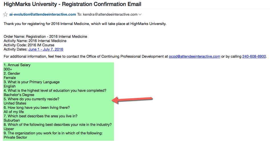 The AI_FORMRESPONSES email tag is used to insert a user's submitted Questions and Answers via electronic Form. This tag works in two scenarios; Form Confirmation Email and Registration Confirmation Email.