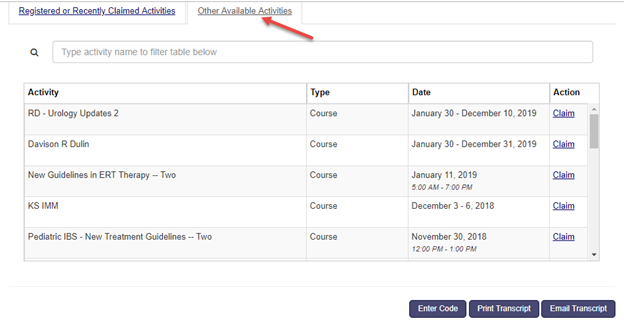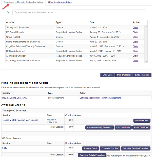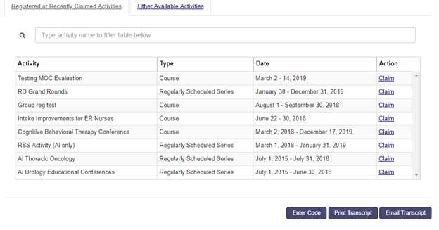 The Other Available Activities tab lists all the activities that are set up as ‘Claim credit open Access = yes’ or the activities that don’t have registration. This essentially means users do not have to be in the ActRegistrant role in order for them to claim for the Sessions they have attended.