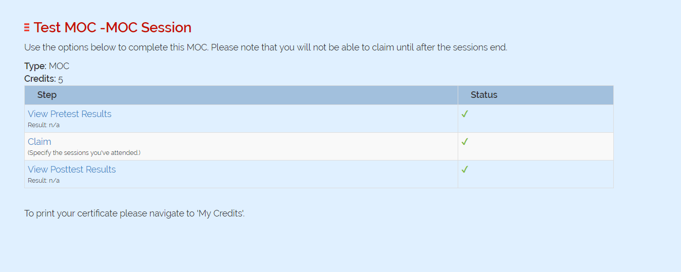 The Session you have entered will show up in the list. Click on 'Print Certificate'. Your Certificate will show the no. of CME Credits and the no. of MOC points you can earn from this Activity.