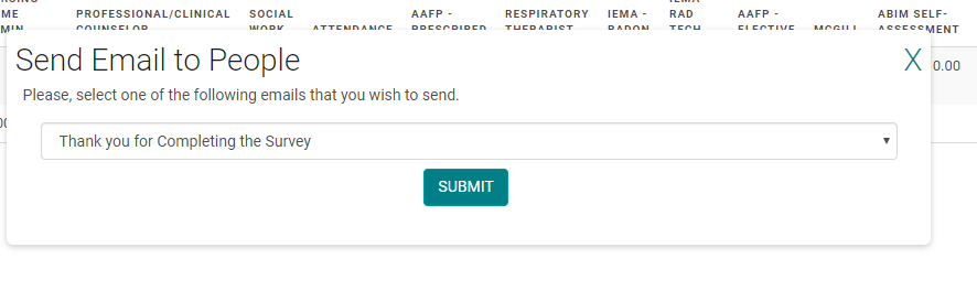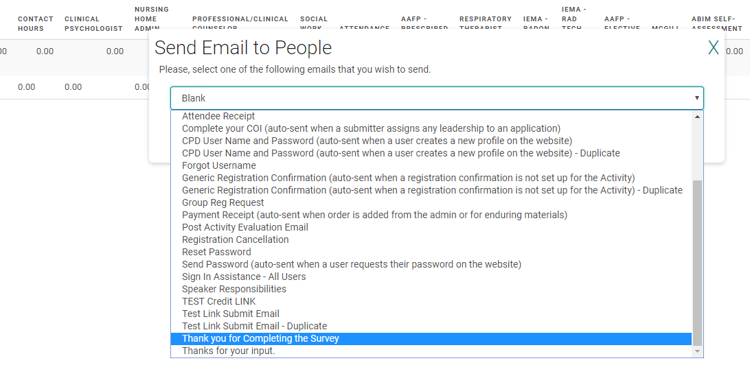 If you would like to send to the people who claimed credits, go to Sessions>CME Reports>Credits by Session > Run ReportIf you would like to send to people who were in the ActRegistrant role, whether claimed or not, go to People>Person Reports>Contact Info>Assigned Role : select the role; Activity: select the Activity> Run Report
