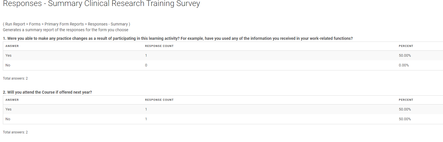 Go to Reports> Run Report > Forms > Primary Form Reports > Responses – Summary > Select the form and Run Report.