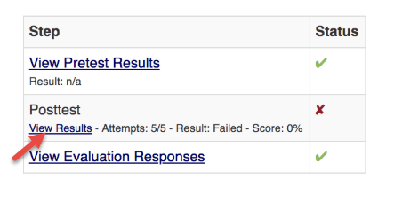 Note: if the user has used up all of his/her test attempts and failed, the Evaluation step (if present) will still be available for completion. However, completion of the evaluation at that point does not award credit if the post-test is weighted (i.e., they failed).